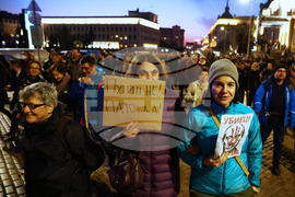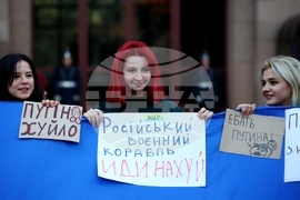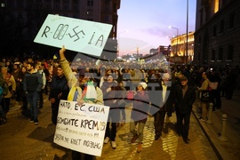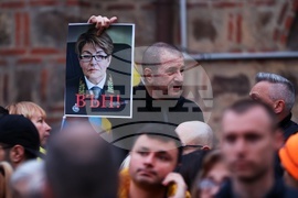 София (24 март 2022) Шествие в подкрепа на Украйна се провежда на площад "Независимост" в столицата. На снимката: протестиращ държи снимка с лика на руския посланик Елеонора Митрофанова.