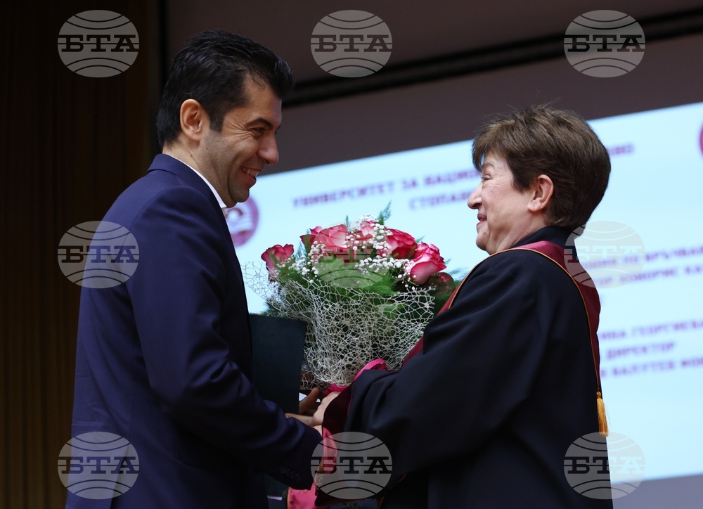 София (17 май 2022) Управляващият директор на МВФ Кристалина Георгиева получава почетното звание "Доктор хонорис кауза" на УНСС в аула "Максима" на университета. На снимката: министър-председателят Кирил Петков.