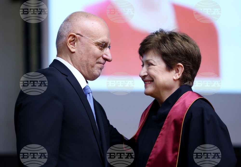 София (17 май 2022) Управляващият директор на МВФ Кристалина Георгиева получава почетното звание "Доктор хонорис кауза" на УНСС в аула "Максима" на университета. На събитието присъства и Димитър Радев ( втори от дясно наляво)- управител на Българската народна банка.