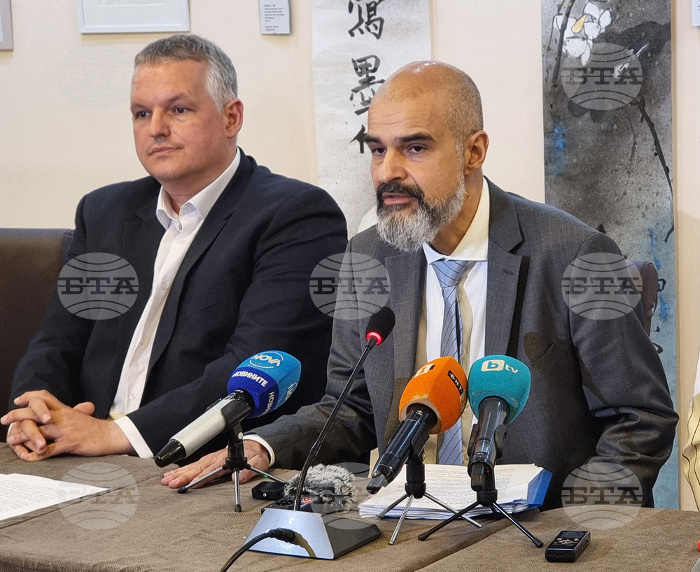 Варна (16 септември 2025) Членове на коалицията „Продължаваме промяната - Демократична България" във Варна дават пресконференция, с която призовават гражданите да излязат отново утре на протест срещу задържането на кмета Благомир Коцев в ареста. Началото на протеста ще бъде от 18,30 ч. пред сградата на Общината в града. На снимката: Антон Тонев и изпълняващият функциите кмета на Варна Павел Попов (вдясно).
