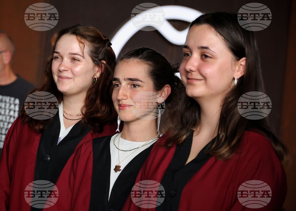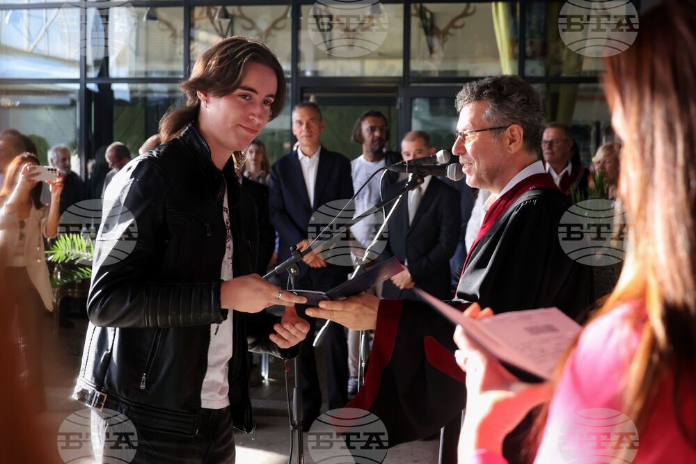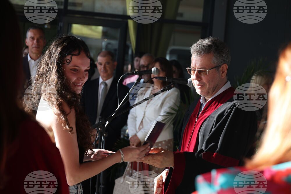 Бургас (18 септември 2025) На територията на Пристанищния комплекс - Магазия 1, се провежда церемония по откриване на новата учебна година на Националната художествена академия (НХА) - Филиал Бургас. Събитието включва празничен водосвет и музикални изпълнения на ученици от Националното училище за музикално и сценично изкуство (НУМСИ) "Проф. Панчо Владигеров" - Бургас. На снимката: директорът на Филиал Бургас на НХА проф. д-р Светозар Бенчев (вляво) връчва студентските книжки на студентите от първи курс.