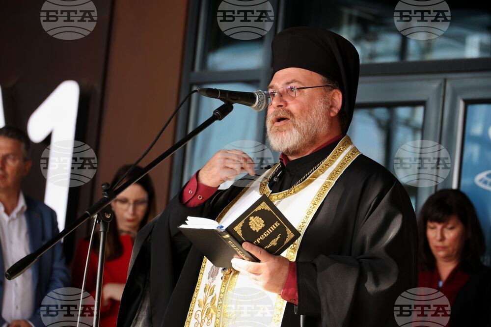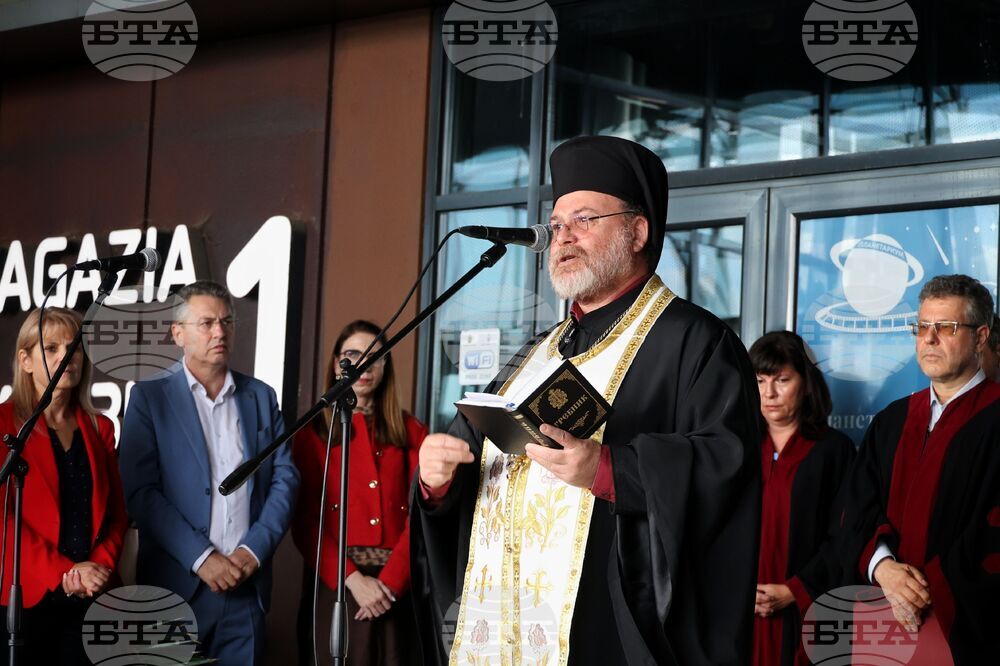 Бургас (18 септември 2025) На територията на Пристанищния комплекс - Магазия 1, се провежда церемония по откриване на новата учебна година на Националната художествена академия (НХА) - Филиал Бургас. Събитието включва празничен водосвет и музикални изпълнения на ученици от Националното училище за музикално и сценично изкуство (НУМСИ) "Проф. Панчо Владигеров" - Бургас. На снимката: архимандрит Димитрий (в средата).