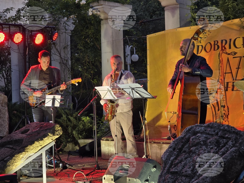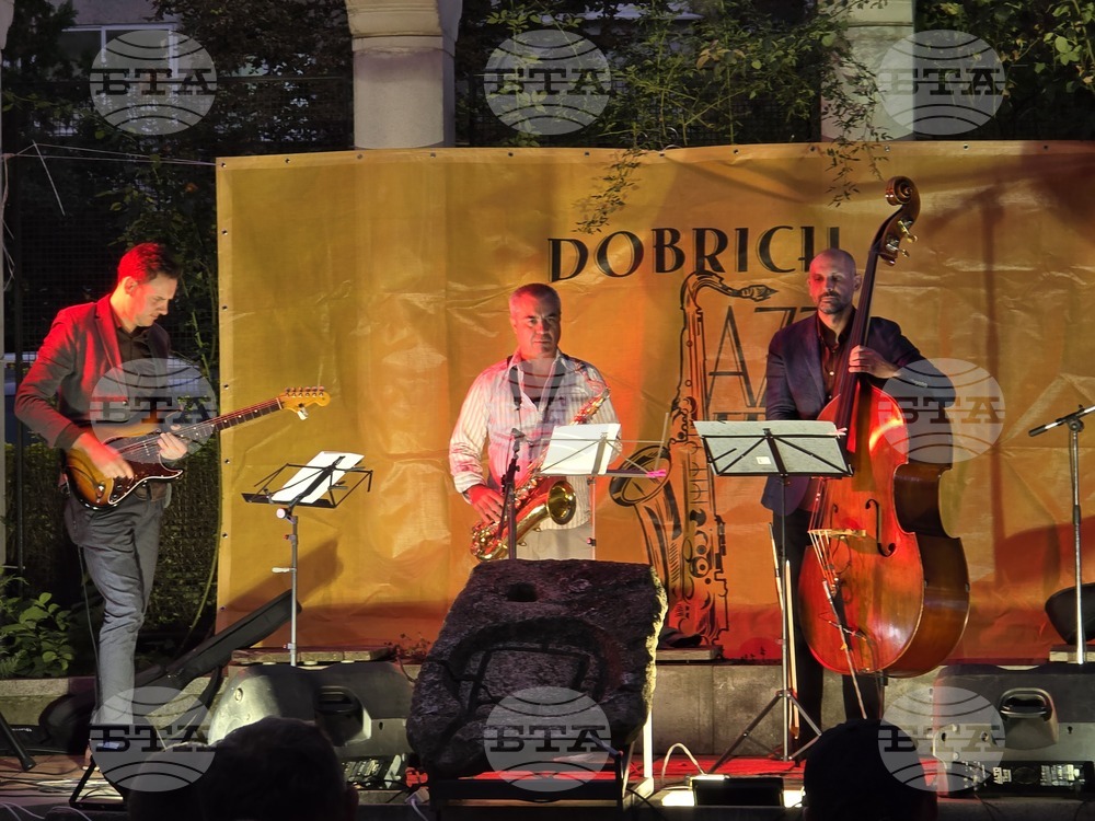 Добрич (19 септември 2025) Четвъртото издание на „Добрич джаз фест” се провежда на Лапидариума в центъра на града. На снимката: Александър Логозаров (китара), Петър Момчев (саксофон), Васил Хаджигрудев (контрабас).