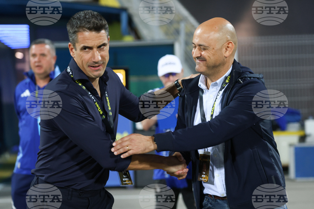 (вляво)София (19 септември 2025) Футболна среща от девети кръг на Efbet лига се провежда между отборите на Левски и Лудогорец на стадион " Георги Аспарухов ". На снимката: старши треньорът на Левски Хулио Веласкес и старши треньорът на Лудогорец Руи Мота (вдясно).
