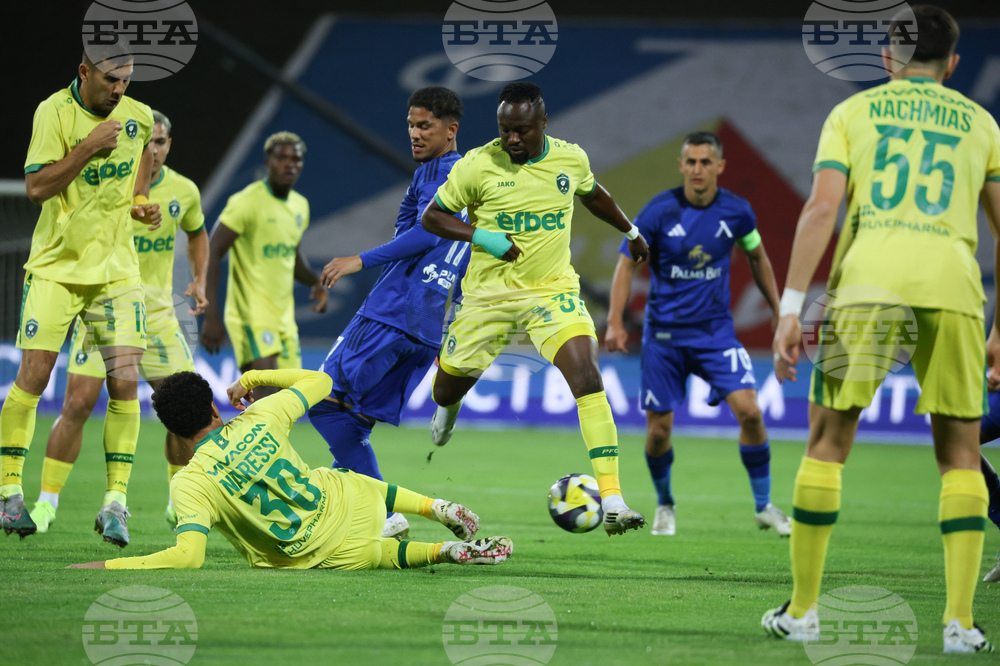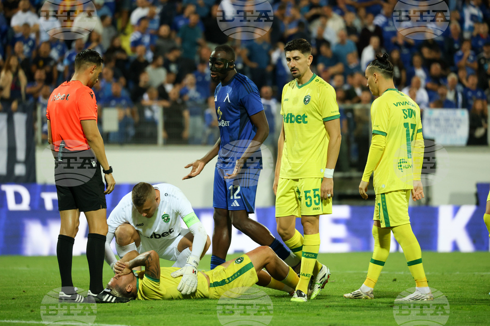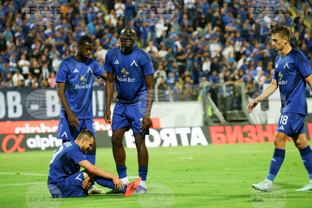 София (19 септември 2025) Футболна среща от девети кръг на Efbet лига се провежда между отборите на Левски и Лудогорец на стадион " Георги Аспарухов ". На снимката: Радослав Кирилов (долу) и от ляво надясно прави Карл Фабиен, Мустафа Сангаре и Гашпер Търджин.