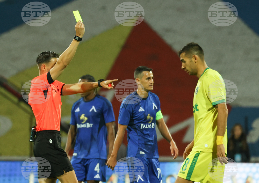 София (19 септември 2025) Футболна среща от девети кръг на Efbet лига се провежда между отборите на Левски и Лудогорец на стадион " Георги Аспарухов ". На снимката: Главният съдия Радослав Гидженов показва жълт картон на халфа на Лудогорец Ивайло Чочев.