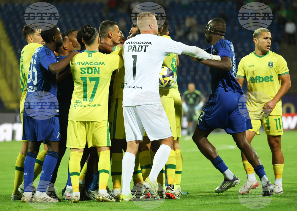 София (19 септември 2025) Футболна среща от девети кръг на Efbet лига се провежда между отборите на Левски и Лудогорец на стадион " Георги Аспарухов ". На снимката: Съдията Радослав Гидженов (вляво) и спортният директор на Лудогорец Козмин Моци (вдясно).