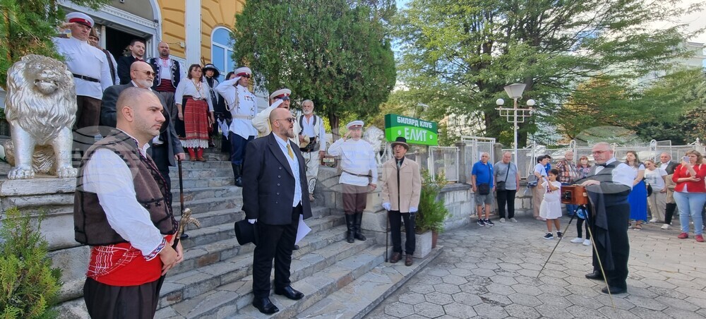 Шумен (22 септември 2025) Членове на Родолюбивия комитет „Кан Крум Страшний“ в Шумен представят пред сградата на Военния клуб в града, възстановка посветена на 117 години от обявяването на Независимостта на България и пресъздаваща историческите събития от 22 септември 1908 г., когато българската държава окончателно отхвърля васалната си зависимост и заема равноправно място сред свободните европейски държави. На снимката: Бе пресъздаден и момента, в който в Шумен е получена телеграма, че княз Фердинанд обявява независимостта на България с манифест, прочетен пред събралите се десетки граждани от историка Явор Якимов (в средата), който е и директор на Профилираната езикова гимназия „Никола Вапцаров“ в града.