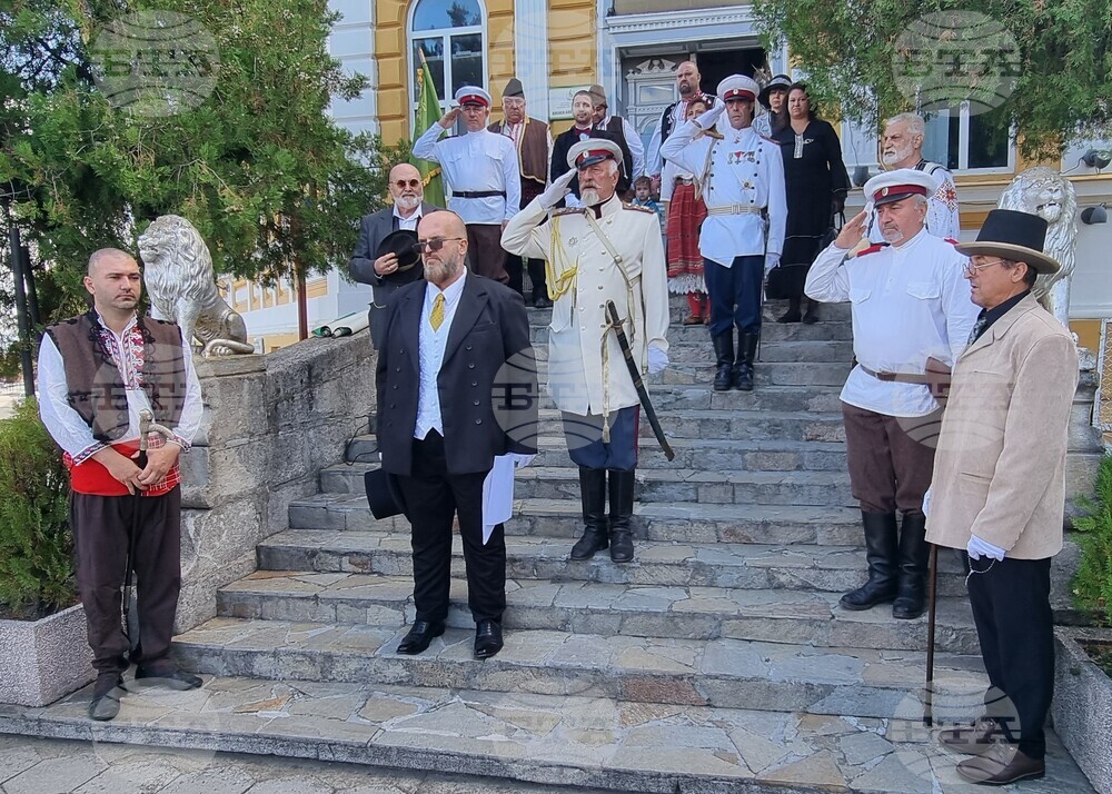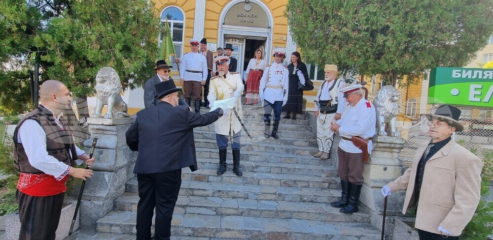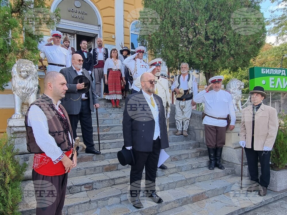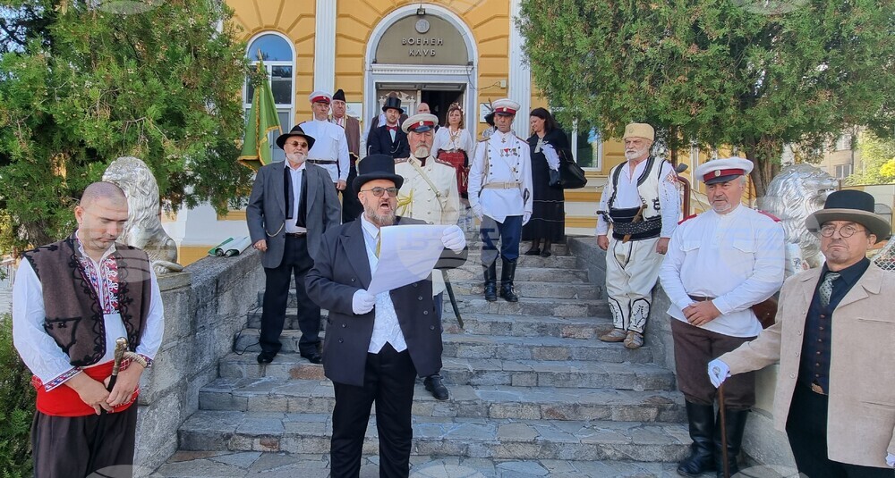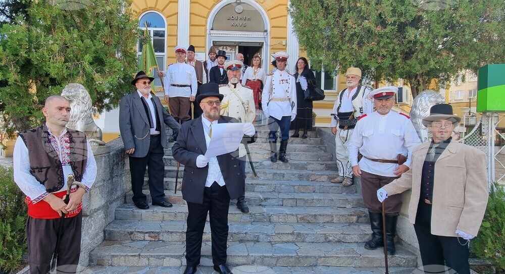 Шумен (22 септември 2025) Членове на Родолюбивия комитет „Кан Крум Страшний“ в Шумен представят пред сградата на Военния клуб в града, възстановка посветена на 117 години от обявяването на Независимостта на България и пресъздаваща историческите събития от 22 септември 1908 г., когато българската държава окончателно отхвърля васалната си зависимост и заема равноправно място сред свободните европейски държави.