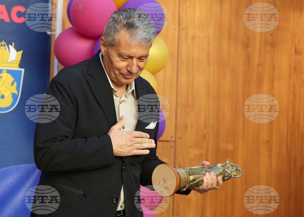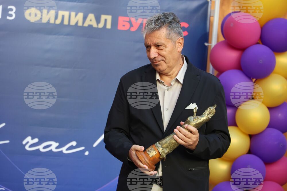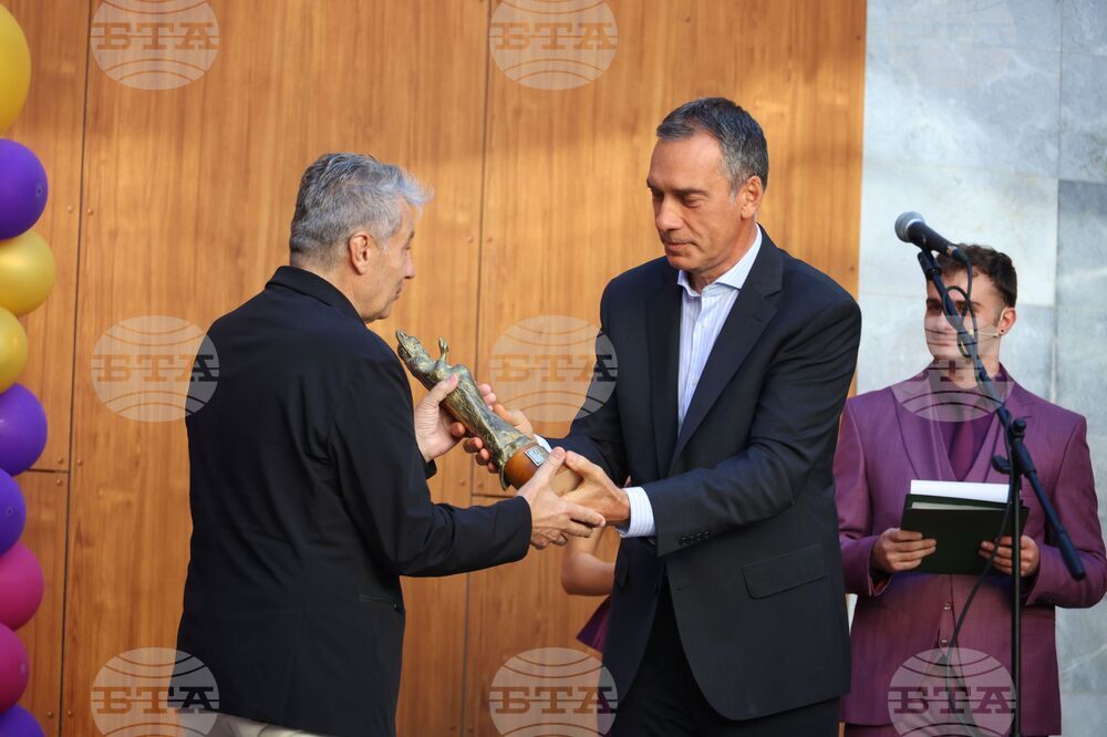 Бургас (23 септември 2025) В Културен дом „НХК“ се провежда церемония по откриване на Филиал Бургас на Националната академия за театрално и филмово изкуство (НАТФИЗ) „Кръстьо Сарафов“ и откриване на новата учебна година. Събитието включва представяне на екипа, който ще преподава в Бургас, тържествен водосвет и музикална програма. На снимката: кметът на Община Бургас Димитър Николов връчва статуетка „Свети Николай Чудотворец" на ректора на НАТФИЗ чл.-кор. проф. дфн Мирослав Дачев (вляво).