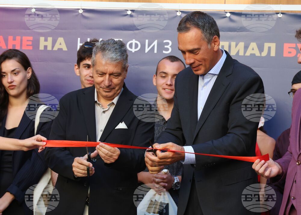 Бургас (23 септември 2025) В Културен дом „НХК“ се провежда церемония по откриване на Филиал Бургас на Националната академия за театрално и филмово изкуство (НАТФИЗ) „Кръстьо Сарафов“ и откриване на новата учебна година. Събитието включва представяне на екипа, който ще преподава в Бургас, тържествен водосвет и музикална програма. На снимката: ректорът на НАТФИЗ чл.-кор. проф. дфн Мирослав Дачев (вляво) и кметът на Община Бургас Димитър Николов (вдясно) прерязват символична лента за откриването на филиала.