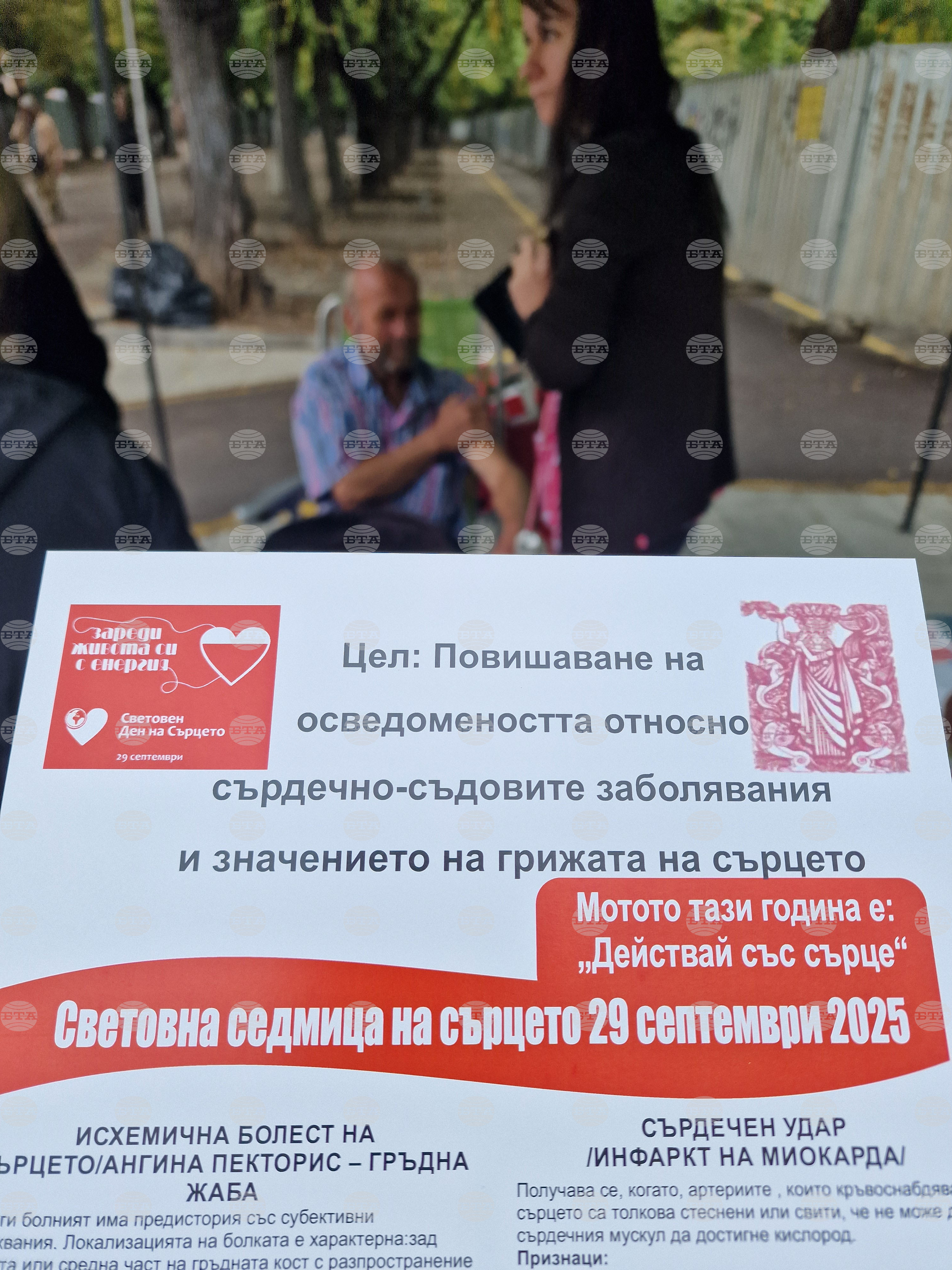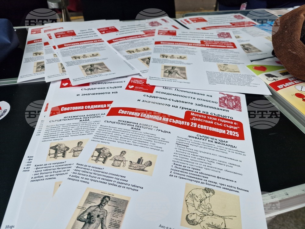 Стара Загора (29 септември 2025) По повод Световния ден на сърцето Регионална здравна инспекция – Стара Загора, в партньорство с Управителния съвет на Българската асоциация на професионалистите по здравни грижи – Регионална колегия Стара Загора провежда информационно-превантивна кампания с Измерване на артериално налягане, Раздаване на здравно-информационни материали и предоставяне на устни и писмени препоръки от медицински специалисти относно исхемична болест на сърцето (ангина пекторис – гръдна жаба) и сърдечен удар (инфаркт на миокарда).