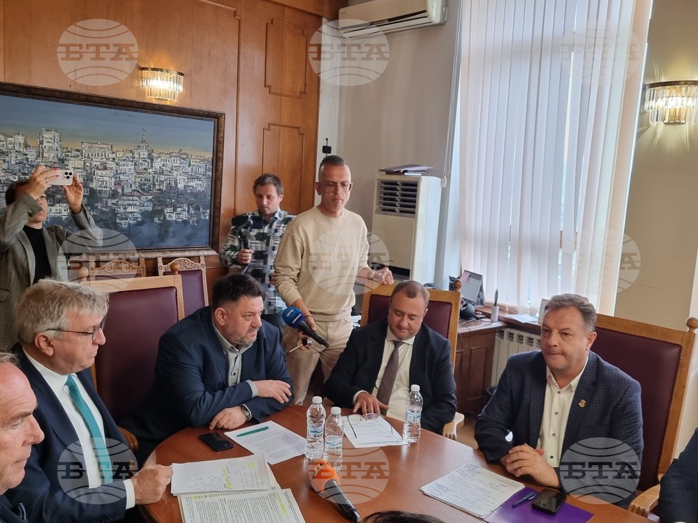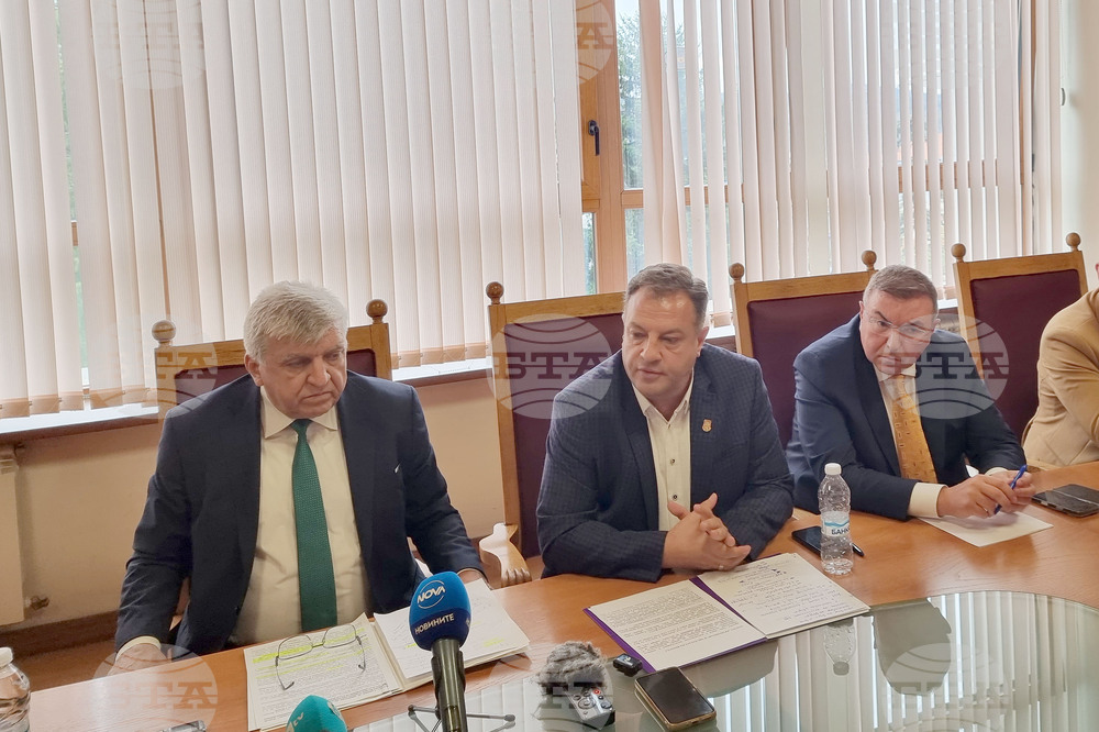 Велико Търново (29 септември 2025) Във връзка със ситуацията около водоподаването в региона и появилите се информации в публичното пространство и социалните мрежи, че във Велико Търново се очаква воден режим се провежда информационна среща по повод намалялото ниво на язовир "Йовковци". На снимката (от ляво надясно): министърът на регионалното развитие и благоустройството Иван Иванов, кметът на Велико Търново Даниел Панов и народният представител от ГЕРБ-СДС д-р Костадин Ангелов.