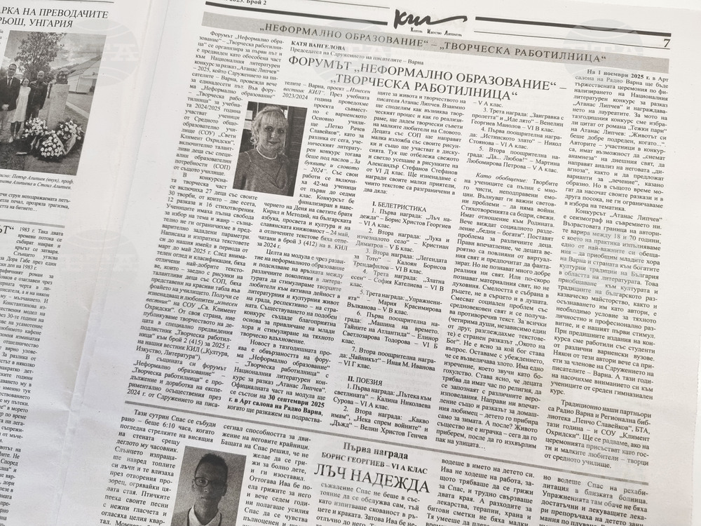 Варна (30 септември 2025) С творческа среща завършва форумът „Неформално образование - творческа работилница“, организиран от Сдружението на писателите във Варна. Той е част от Националния литературен конкурс „Атанас Липчев“. Със свои творби участват деца от Средно училище „Св. Климент Охридски“.