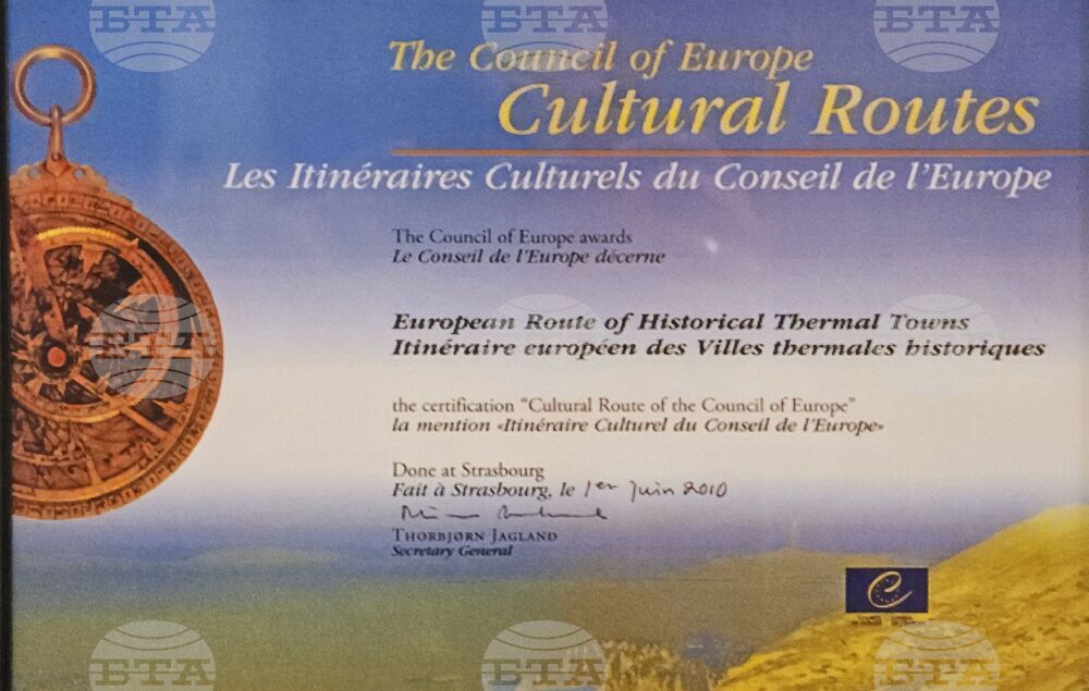 София (30 септември 2025) В Националния пресклуб на БТА министърът на туризма Мирослав Боршош и кметът на Хисаря Ива Вълчева направиха изявление. На събитието присъства и генералният директор на БТА Кирил Вълчев. На снимката: копие от сертификата за членството на Хисаря в Европейската асоциация на историческите термални градове.
