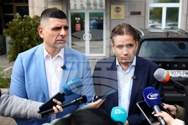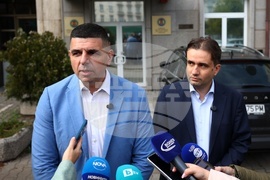 София (13 октомври 2025) Съпредседателите на „Да, България“ Божидар Божанов и Ивайло Мирчев (вляво) дават изявление за медиите пред сградата на Комисията за противодействие на корупцията.