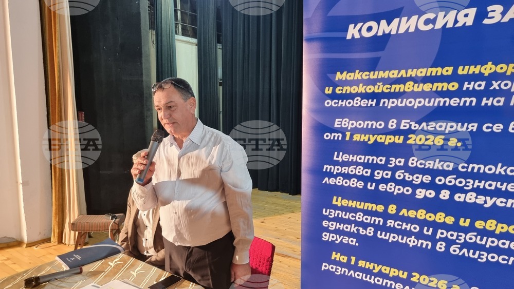 Симеоновград (14 октомври 2025) Информационна среща в рамките на кампанията на Комисията за защита на потребителите (КЗП) се състои в Симеоновград. Директорът на НАП в Хасково Любомир Делчев (вляво) и главният инспектор от Териториален отдел на КЗП - Хасково Васил Донев дадоха подробни разяснения по процеса на преминаване към единната европейска валута.