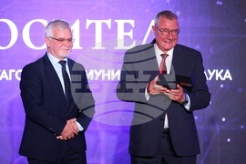 София (14 октомври 2025) Министерството на образованието и науката (МОН) връчва годишните Национални награди за принос в науката „Питагор”. На снимката (от ляво надясно): заместник-министърът на образованието Николай Витанов връчва призът в категория „Комуникация на науката“ на проф. Христо Пимпирев от СУ „Св. Климент Охридски“, който е създател, двигател и посланик на българските полярни изследвания.