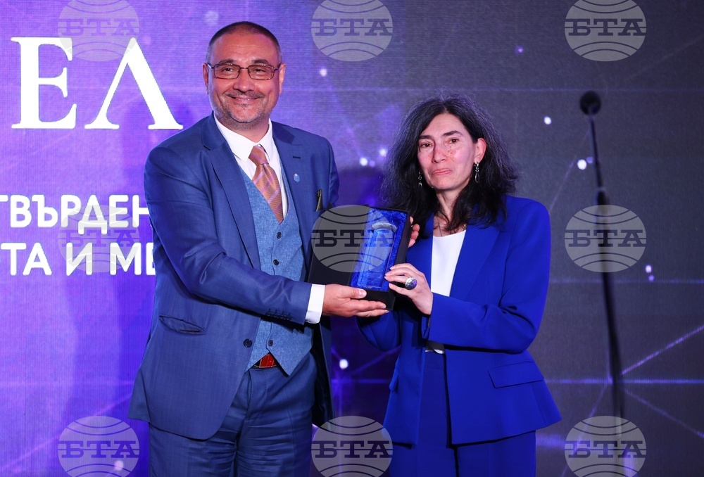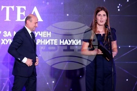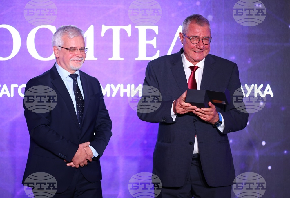 София (14 октомври 2025) Министерството на образованието и науката (МОН) връчва годишните Национални награди за принос в науката „Питагор”. На снимката (от ляво надясно): министърът на образованието Красимир Вълчев и носителката на Голямата награда „Питагор“ за цялостен принос в науката проф. Радостина Стоянова от Института по обща и неорганична химия към БАН.
