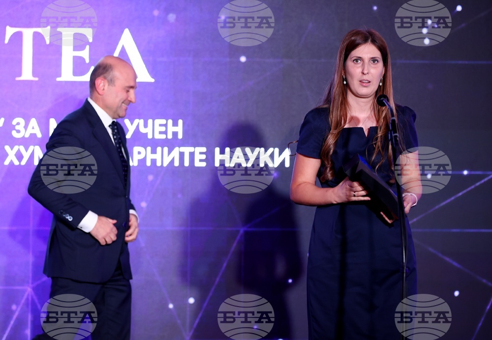 София (14 октомври 2025) Министерството на образованието и науката (МОН) връчва годишните Национални награди за принос в науката „Питагор”. На снимката (от ляво надясно): заместник-министърът на иновациите и растежа Мартин Дановски връчва награда „Питагор“ в областта на науката на главен асистент доктор Меги Дакова от ПУ „Пайсии Хилендарски”.