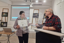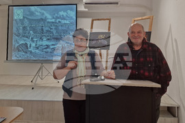 Исперих (17 октомври 2025) Нови открития и любопитни факти от теренните проучвания на пещерите в Археологическия резерват „Сборяново“ и Държавното ловно стопанство „Воден – Ири Хисар“ бяха представени на среща в Исперих. На снимката: директорът на Исторически музей в Исперих Теодора Василева и почетният президент на Балканския спелеоложки съюз Алексей Жалов.