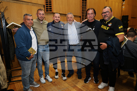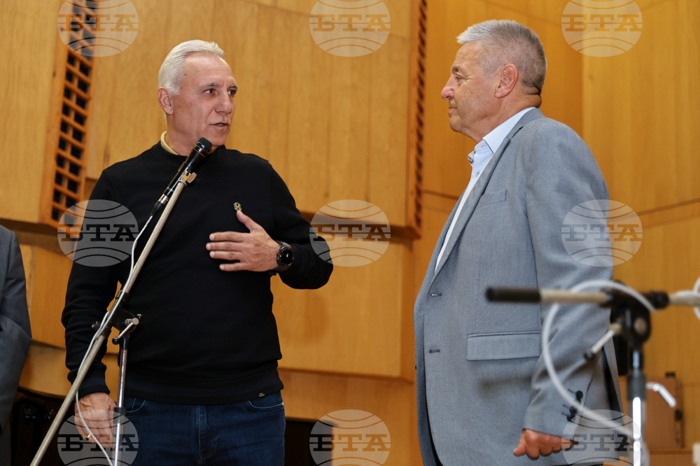 Пловдив (17 октомври 2025) В Първо студио на Българското национално радио - Радио Пловдив - на специална церемония се представя автобиографичната книга на легендарния български футболист Петър Зехтински. На снимката: Христо Стоичков и Петър Зехтински (вдясно).