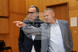 Пловдив (17 октомври 2025) В Първо студио на Българското национално радио - Радио Пловдив - на специална церемония се представя автобиографичната книга на легендарния български футболист Петър Зехтински. На снимката: Христо Стоичков и Петър Зехтински (вдясно)