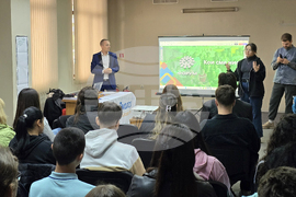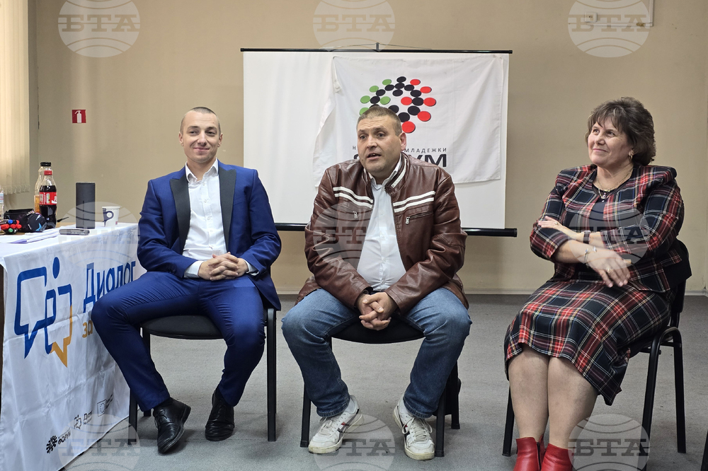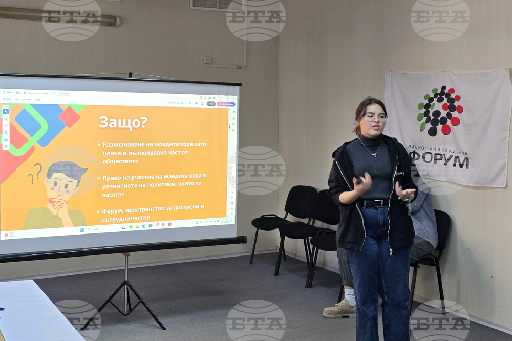 Плевен (20 октомври 2025) В Плевен младежи се срещнаха с представители на местната власт и представиха свои идеи. На снимката: членът на управителния съвет на Национален младежки форум Антон Начев (вляво).