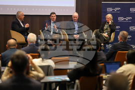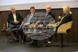 София (21 октомври 2025) Първи панел от Годишната конференция на Международната асоциация на обществените медии (Public Broadcasters International) на тема „Състоянието на обществените медии“ се провежда в зала „Васил Левски“ на хотел „Хаят Риджънси“. На снимката (от ляво надясно): телевизионният водещ и продуцент в Българска национална телевизия (БНТ) Бойко Василев, генералният директор на Българското национално радио (БНР) Милен Митев, управляващият директор на ABC (Австралия) Хю Маркс, председателят на управителния съвет в RTV SLO (Словения) Наталия Горшчак.