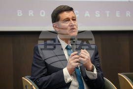 София (21 октомври 2025) Първи панел от Годишната конференция на Международната асоциация на обществените медии (Public Broadcasters International) на тема „Състоянието на обществените медии“ се провежда в зала „Васил Левски“ на хотел „Хаят Риджънси“. На снимката: телевизионният водещ и продуцент в Българска национална телевизия (БНТ) Бойко Василев.