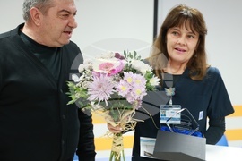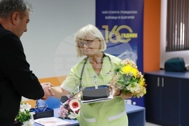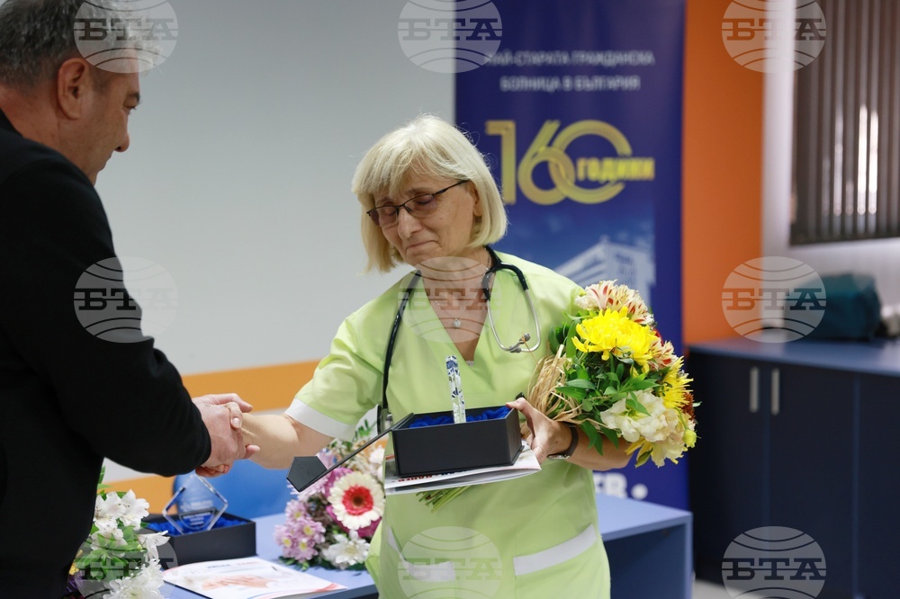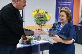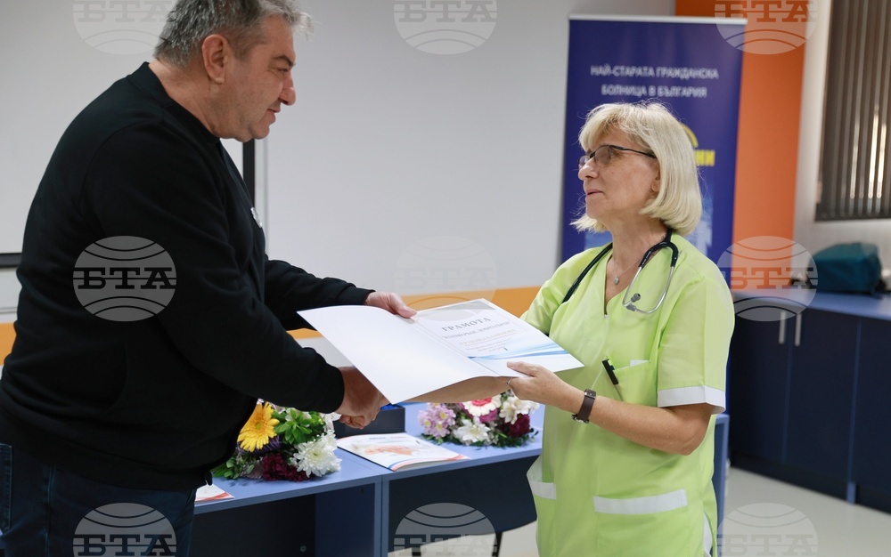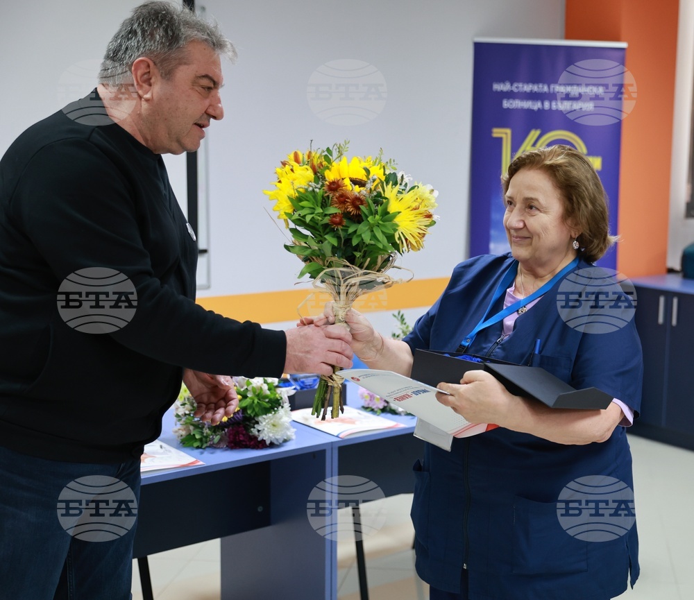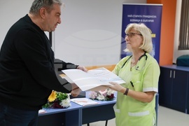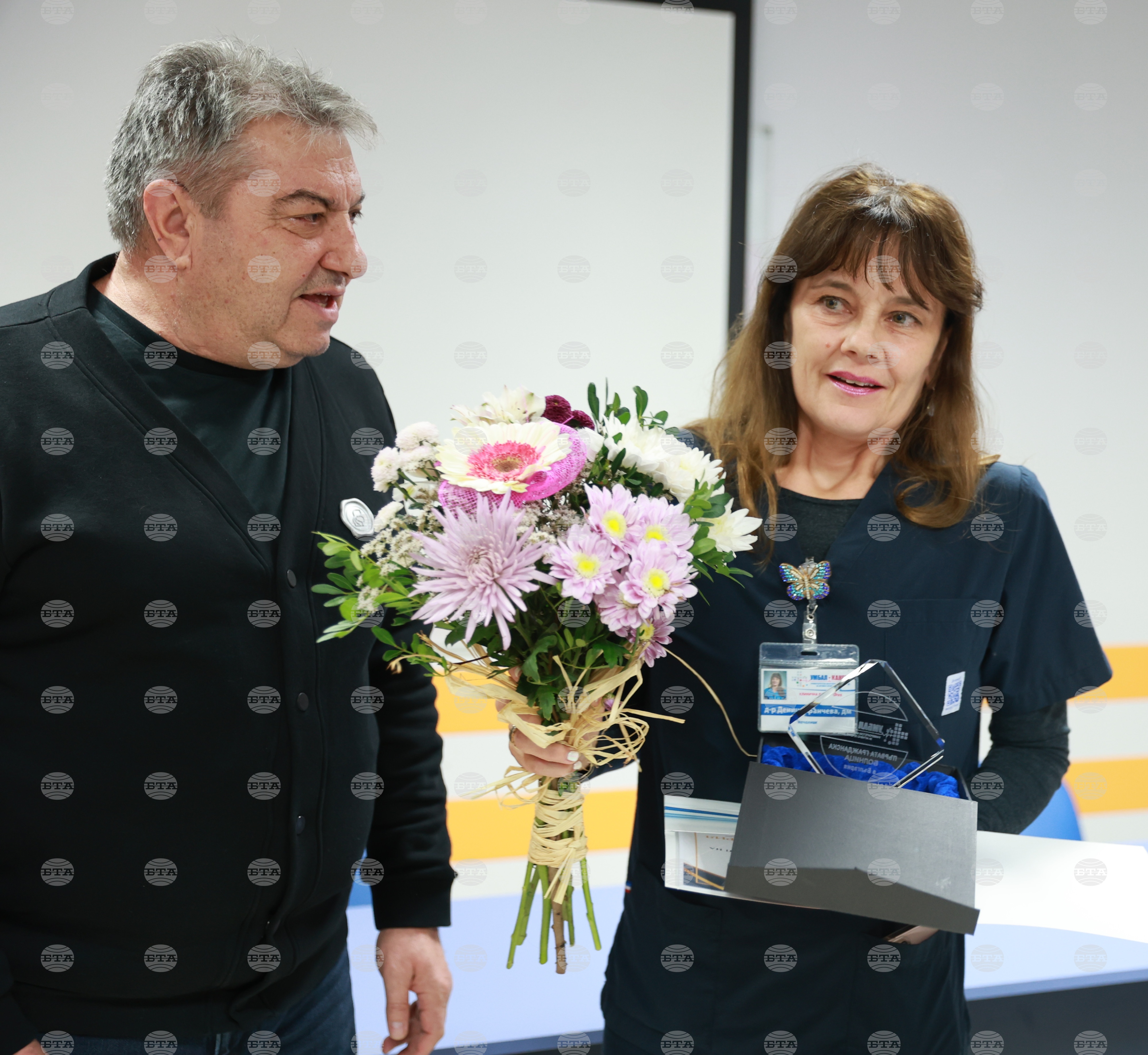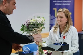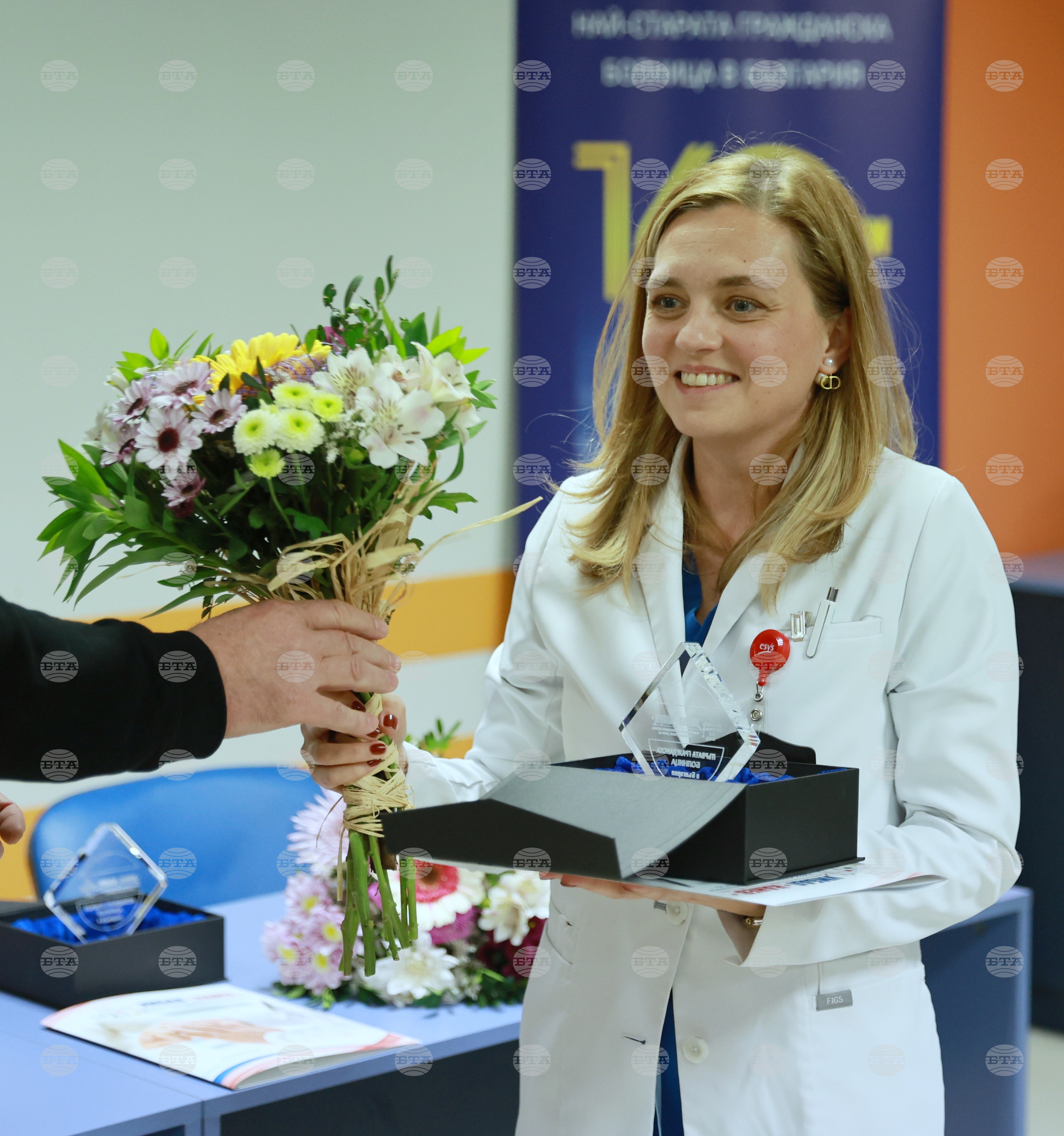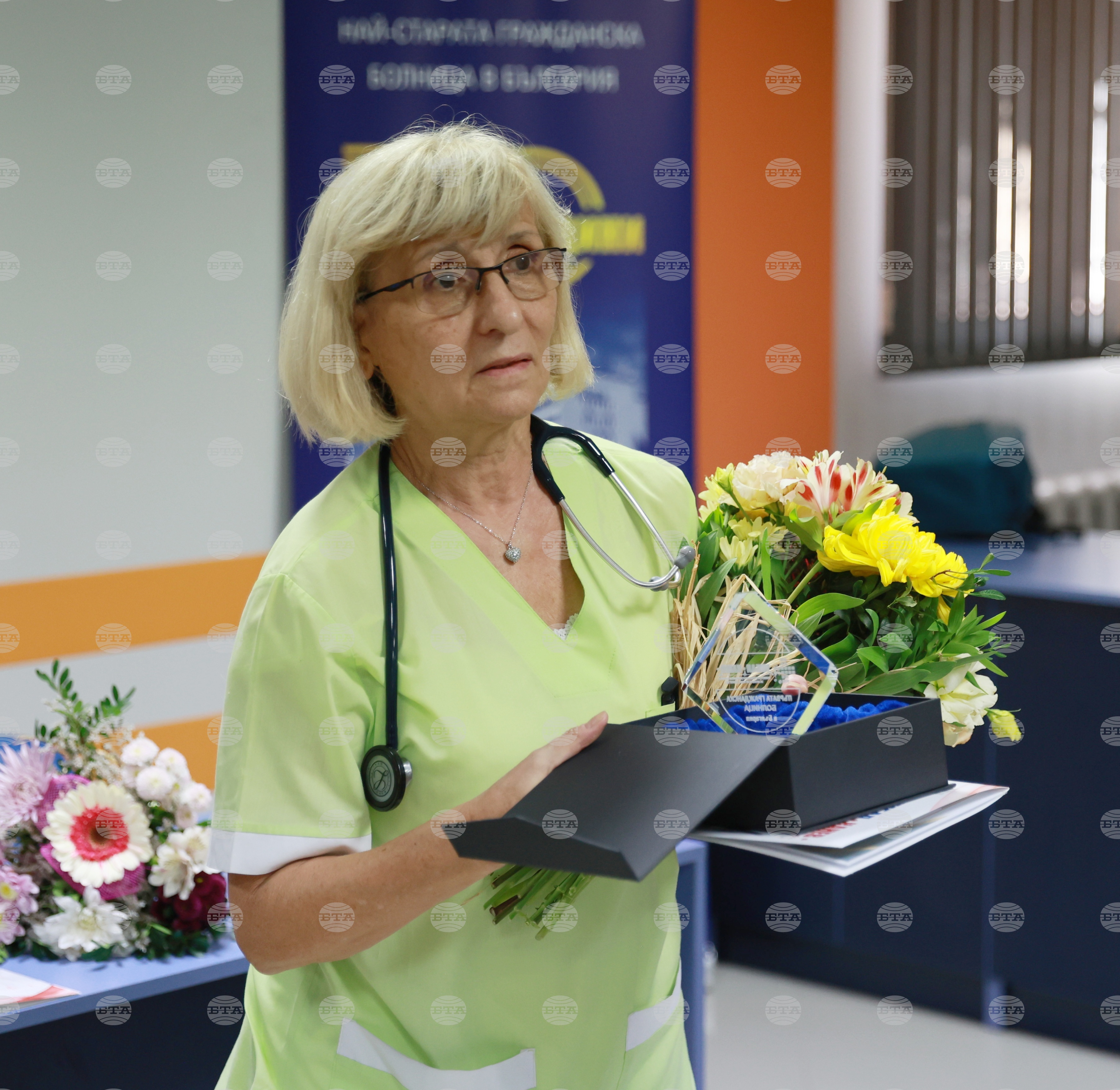 Русе (21 октомври 2025) Трима лекари и един от екипите на Университетската многопрофилна болница за активно лечение (УМБАЛ) „Канев“ в Русе бяха отличени в инициативата „Златни ръце, добро сърце“ на лечебното заведение. Те получиха специални грамоти и плакети от изпълнителния директор на болницата Иван Иванов (вляво). На снимката: д-р Йонка Костова.