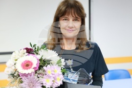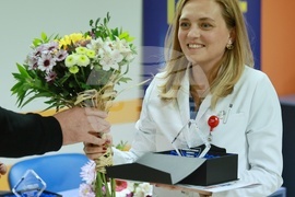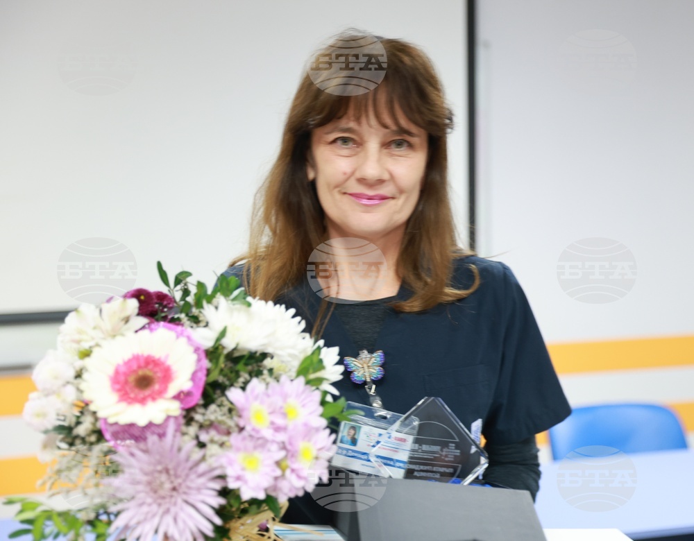 Русе (21 октомври 2025) Трима лекари и един от екипите на Университетската многопрофилна болница за активно лечение (УМБАЛ) „Канев“ в Русе бяха отличени в инициативата „Златни ръце, добро сърце“ на лечебното заведение. Те получиха специални грамоти и плакети от изпълнителния директор на болницата Иван Иванов. На снимката: д-р Деница Транчева