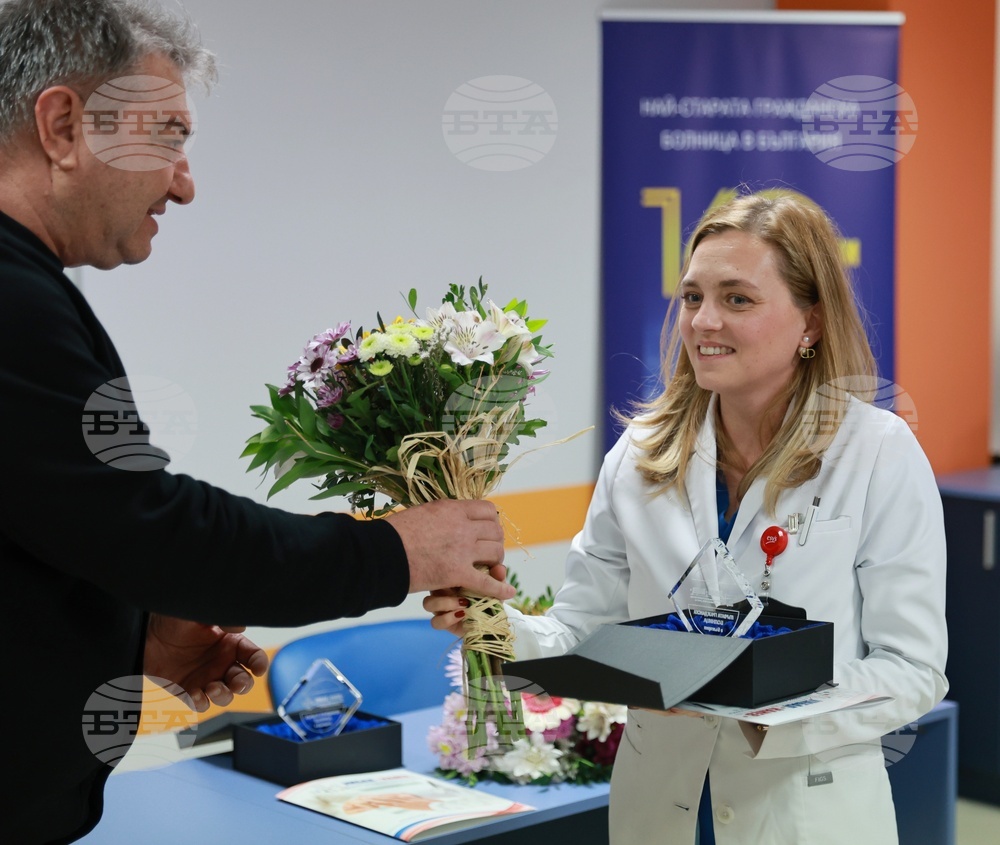 Русе (21 октомври 2025) Трима лекари и един от екипите на Университетската многопрофилна болница за активно лечение (УМБАЛ) „Канев“ в Русе бяха отличени в инициативата „Златни ръце, добро сърце“ на лечебното заведение. Те получиха специални грамоти и плакети от изпълнителния директор на болницата Иван Иванов (вляво). На снимката: д-р Деница Транчева.