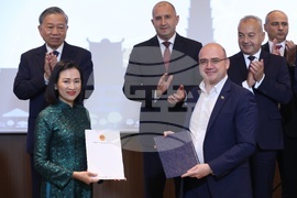 София (23 октомври 2025) Изпълнителната агенция за насърчаване на малките и средни предприятия (ИАНМСП) и Агенцията за чуждестранни инвестиции на Виетнам (FIA) организират днес бизнес форум "Възможности за бизнес сътрудничество между Република България и СР Виетнам". Церемония по размяна на Меморандум за разбирателство. На снимката: началникът на отдел "Международно сътрудничество" към Софииски университет "Св. Климент Охридски" Ирена Атанасова и деканът на Училище за информационни и комуникационним технологии към Ханойски университет за наука и технологии Та Хай Тунг.