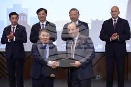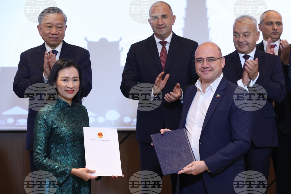 София (23 октомври 2025) Изпълнителната агенция за насърчаване на малките и средни предприятия (ИАНМСП) и Агенцията за чуждестранни инвестиции на Виетнам (FIA) организират днес бизнес форум "Възможности за бизнес сътрудничество между Република България и СР Виетнам". Церемония по размяна на Меморандум за разбирателство. На снимката: представителят на Икономически университет - Варна Илин Димитров и посланикът на Виетнам у нас Нгуен Тхи Мин Нгует.