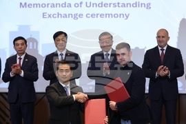 София (23 октомври 2025) Изпълнителната агенция за насърчаване на малките и средни предприятия (ИАНМСП) и Агенцията за чуждестранни инвестиции на Виетнам (FIA) организират днес бизнес форум "Възможности за бизнес сътрудничество между Република България и СР Виетнам". Церемония по размяна на Меморандум за разбирателство. На снимката: основателят и управител на "Ендуросат" Райчо Райчев и заместник-генералният директор на "Виетел груп" Ву Туан Анх.