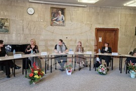 Шумен (23 октомври 2025) Честване на 70-годишния юбилей на Детския отдел на Регионална библиотека „Стилиян Чилингиров“ и начало на националния дискусионен форум „Работата с деца – изкуство и предизвикателство“. На снимката: директорът на Регионална библиотека "Стилиян Чилингиров" д-р Росица Добрева (вляво) и кметът на община Шумен проф. Христо Христов (втори вляво).