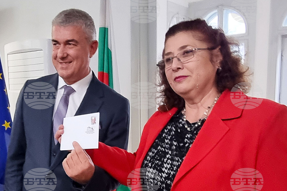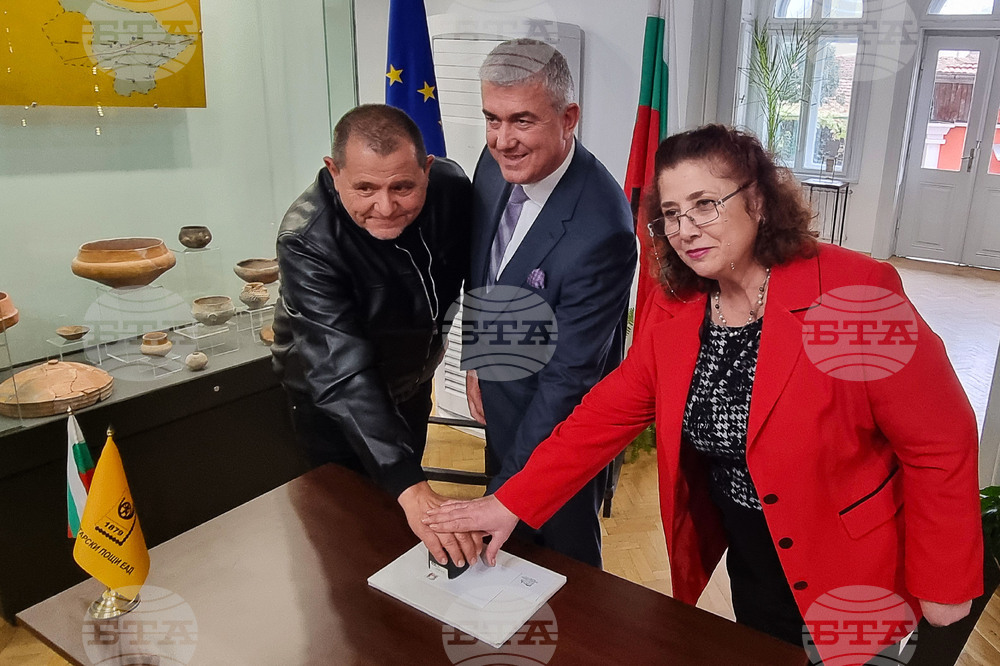 Сливен (24 октомври 2025) В Регионалния исторически музей „Д-р Симеон Табаков“ - Сливен се валидира пощенска марка, посветена на 225 години от рождението на Добри Желязков. На снимката: директорът на РИМ - Сливен доц. д-р Николай Сираков и ръководителят на областна пощенска станция Красимира Панайотова.