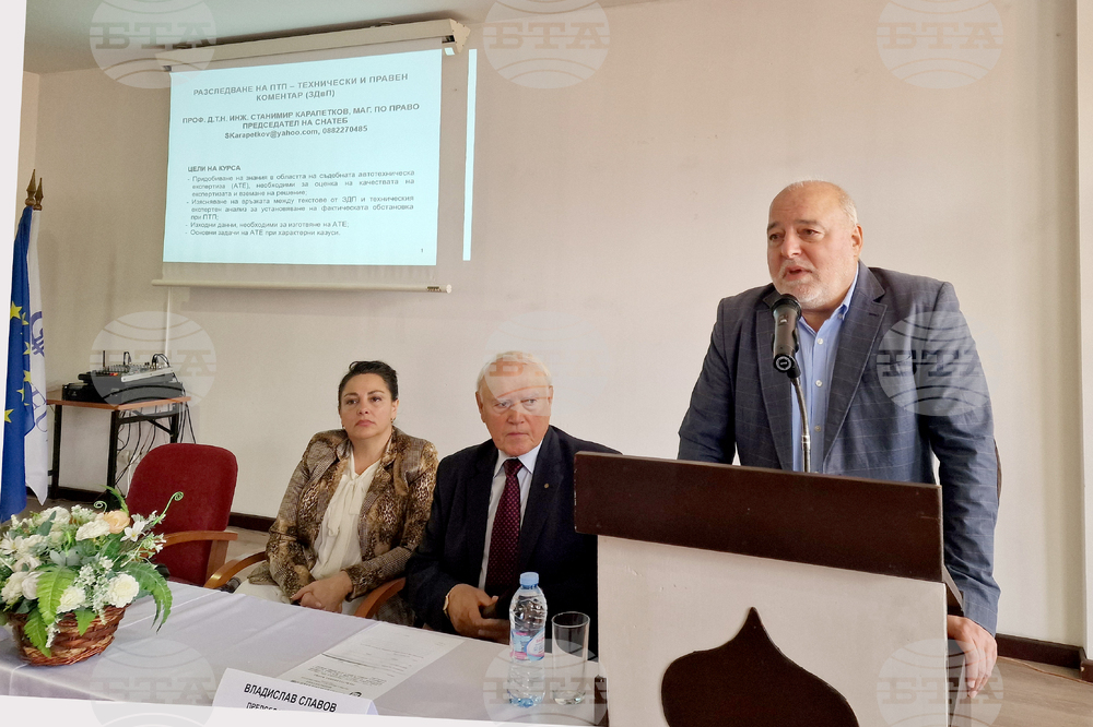 Девин (24 октомври 2025) Обучение на юристи, свързано с разследване на катастрофи и ползване на изкуствен интелект, започна в Девин. Семинарът се организира от Съюза на юристите в България (СЮБ) и от дружеството на СЮБ в Девин. На снимката (от ляво надясно): Деница Вълкова - съдия във Върховен касационен съд (ВКС), Владислав Славов - председател на СЮБ, проф. д.т.н. инж. Станимир Карапетков - експерт автотехнически експертизи.