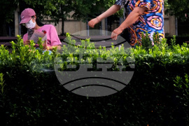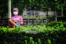 София (5 юли 2022) Жена от азиатски произход, седи на пейка в горещия летен ден с предпазна маска за лице. В последните дни се наблюдава увеличаване на случаите на заболели от Ковид-19.