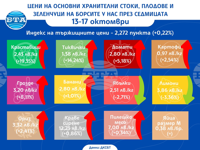ДКСБТ - Цени на основни хранителни стоки, плодове и зеленчуци на борсите у нас през седмицата 13-17 октомври