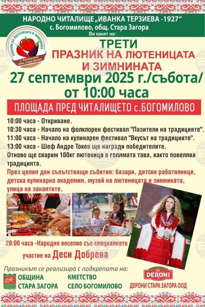 Утре, 27 септември, в старозагорското село Богомилово ще се сварят сто килограма лютеница по време на Третия празник на лютеницата и зимнината. Това съобщават организаторите от местното Народно читалище „Иванка Терзиева – 1927“ на официалната си Фейсбук страница.