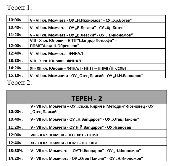 Графикът може да претърпи промени при възникнали наложителни причини, програмите за всяко от състезанията се уточняват на техническите конференции, предшестващи турнирите. За повече информации учителите по физическо възпитание могат да се обръщат към Златина Георгиева – младши експерт спорт в Община Разград - z.georgieva@razgrad.bg.