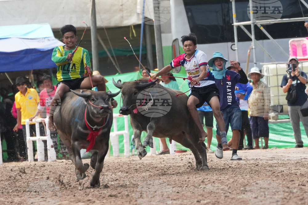 В рамките на фестивала в Чонбури се провежда и състезание с биволи, които спринтират по 100-метрово трасе. Снимка: AP Photo/Sakchai Lalit
