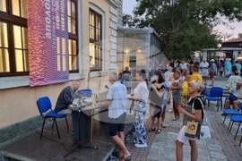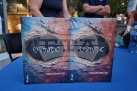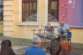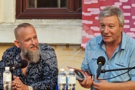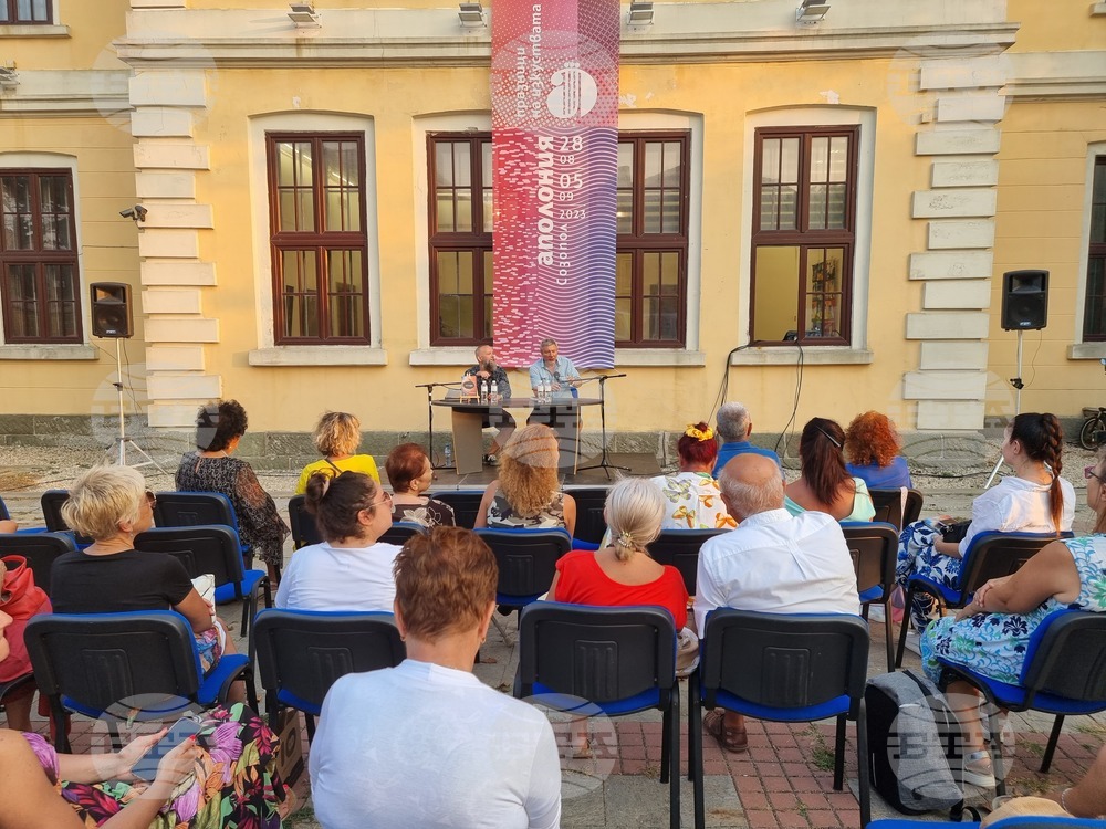 Созопол (31 август 2023) Писателят Радослав Бимбалов (ляво) обяви, че вече е започнал работа по нова книга, която се базира на стара идея, която отдавна отлежава в мислите му. Макар да не знае докъде ще стигне с нея, той допълни: "В момента все още се обичаме с този нов текст". Това той разкри по време разговор, воден от литературния критик Митко Новков (дясно), по време на представянето на последния му роман "Екстазис" в рамките на 39-ото издание на Празници на изкуства "Аполония" в Созопол.