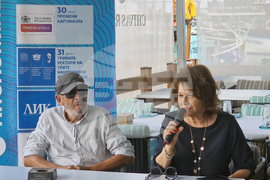 Созопол (5 септември 2025) „60 години Театър 199“ е темата на рубриката „Цената на успеха“ в рамките на 41-ите празници на изкуствата „Аполония“. На снимката: изпълнителният директор на фондация „Аполония“ Маргарита Димитрова и проф. Атанас Атанасов.