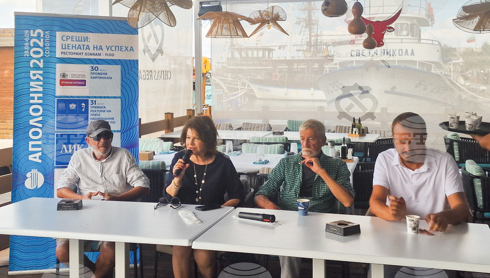 Созопол (5 септември 2025) „60 години Театър 199“ е темата на рубриката „Цената на успеха“ в рамките на 41-ите празници на изкуствата „Аполония“. На снимката (от ляво надясно): проф. Ивайло Христов, изпълнителният директор на фондация „Аполония“ Маргарита Димитрова, проф. Атанас Атанасов и директорът на „Театър 199“ Боян Желязков.
