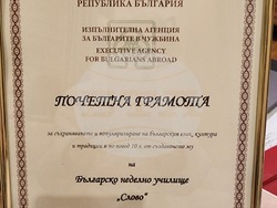 Отличието бе присъдено за принос за утвърждаване, съхранение и популяризиране на българския език, култура, историческо наследство и традиции във Великобритания. Медалът беше връчен по време на тържеството по случай 10-годишнината на БУ „Слово“ от Тихомир Стойчев, посланик на България във Великобритания, посочват от учебното заведение.