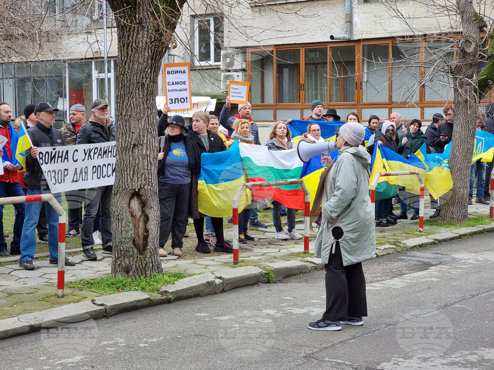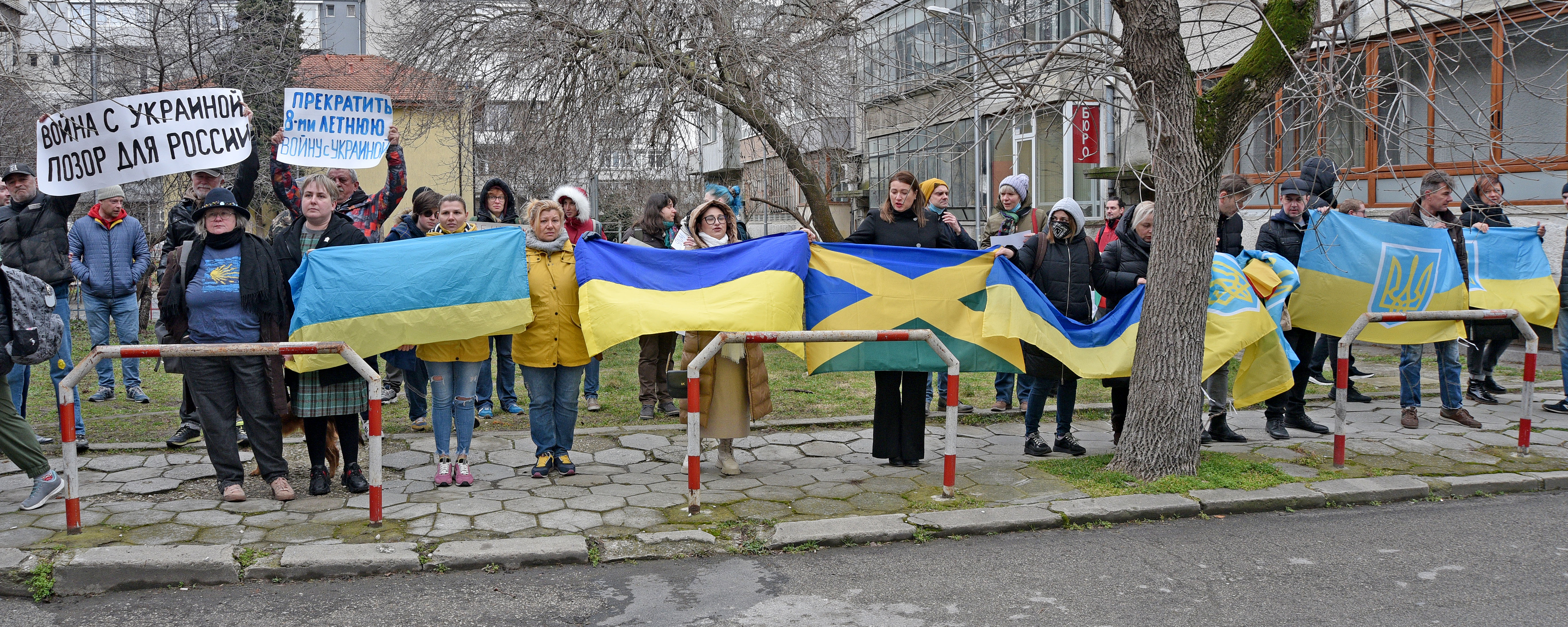 Варна (24 февруари 2022) Украинци и руснаци протестираха пред руското консулство във Варна срещу войната в Украйна. Пресфото-БТА снимка: Красимир Тодоров
