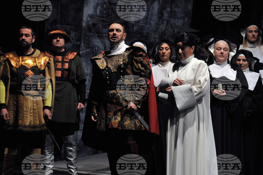 Бургас (15 февруари 2022) Тази вечер на сцената на Държавна опера - Бургас е премиерата на „Трубадур” - една от най-популярните опери на Джузепе Верди. Участват Делян Славов, Даниел Дамянов, Йоана Железчева, Даниела Дякова, Марян Йовановски и хора на операта под палката на маестро Иван Кожухаров. Пресфото-БТА снимка: Тодор Ставрев (ПБ)